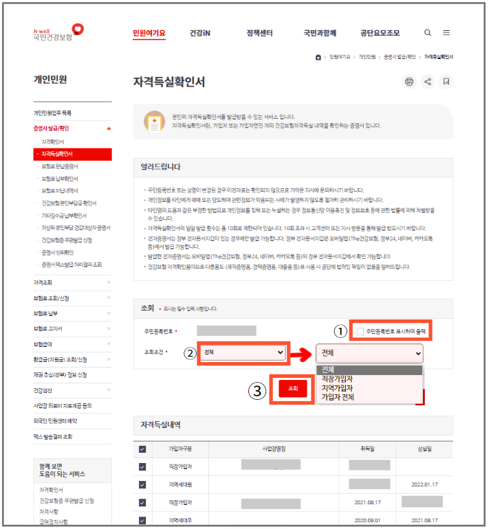 ② [조회조건] : 직장가입자 / 지역가입자 / 가입자 전체