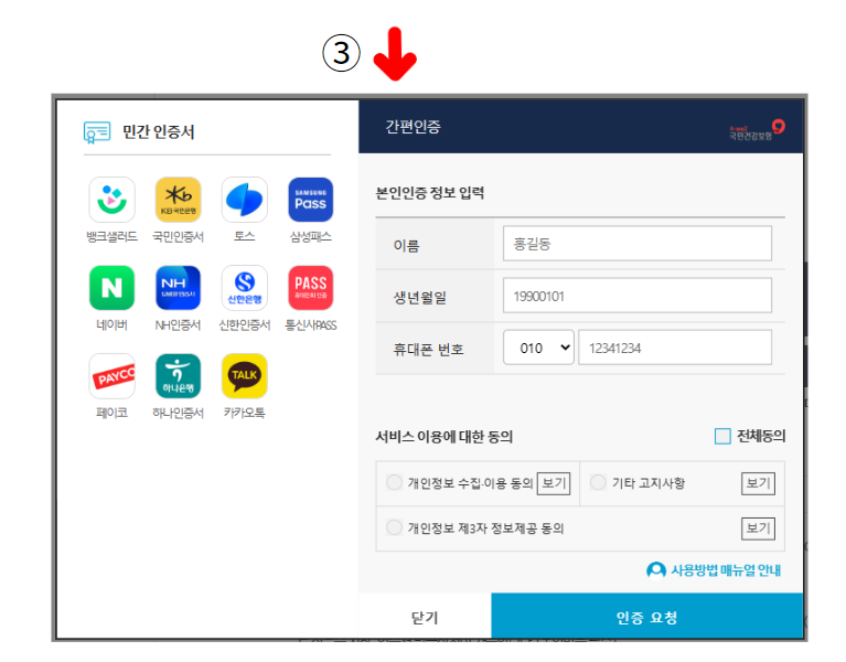 ⓛ 건강보험 홈페이지 → ②로그인 → ③간편인증