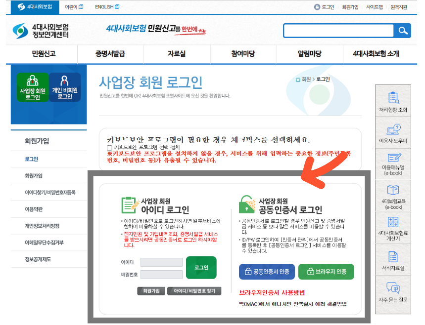 1. 4대보험정보연계센터 홈페이지→로그인