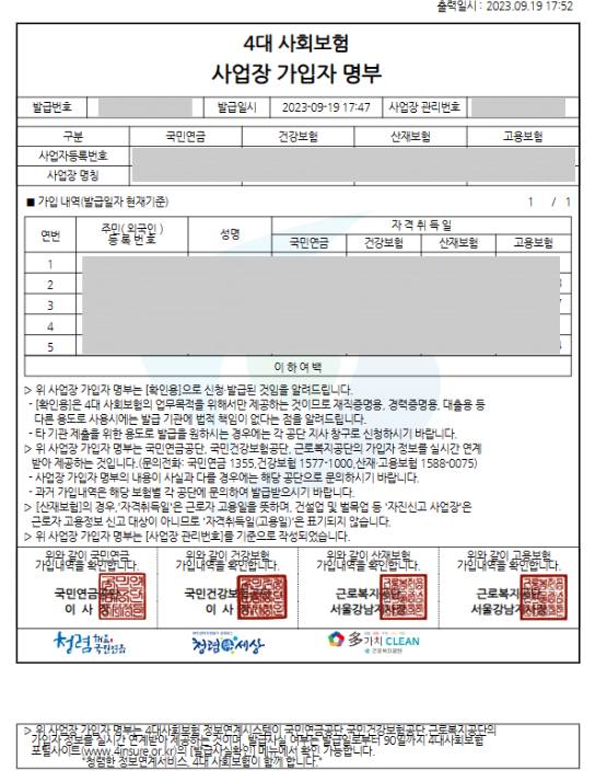 4대보험 가입자명부는 사업장(개인,법인)에서 4대보험(국민연금,건강보험,산재보험,고용보험)에 가입되어 있는 직원을 확인할 수 있는 서류로 정부지원금이나 기타필요 자료로 기관에서 자주 요청하는 서류입니다.