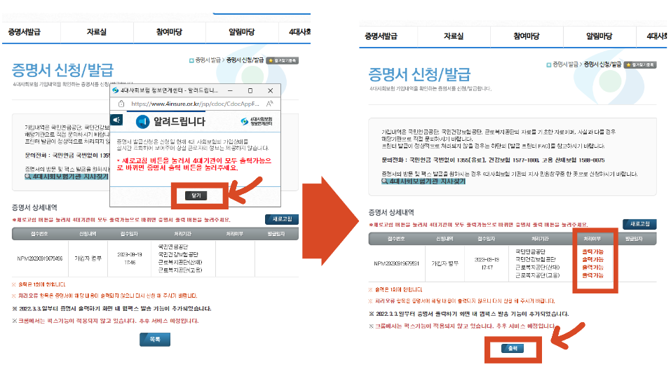 4. 알림팝업창 뜨면 닫기를 합니다.→ 팝업창 닫기 후에 출력버튼이 나타납니다.